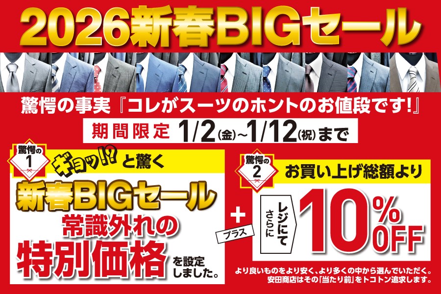 営業時間の変更 2025.12.30 2026年新春BIGセール 1/2~1/12特別営業のお知らせ 2026年は〈柳津店〉〈メンズソーコ各務原店〉は1/2から営業します。〈問屋町店〉は1/3から営業します。 〈柳津店〉〈メンズソーコ各務原店〉1/2〜1/12まで連日営業 〈問屋町店〉1/3〜1/12まで連日営業